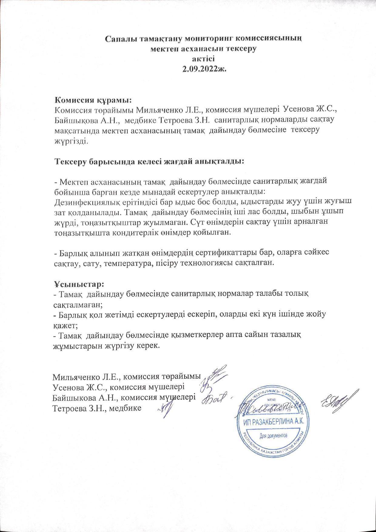02 қыркүйек 2022 0 1 2 3 4 5 Тамақтану сапасын бақылау бойынша мектеп асханасы комиссиясының тексеруі. Обследование школьной столовой комиссией по мониторингу качества питания