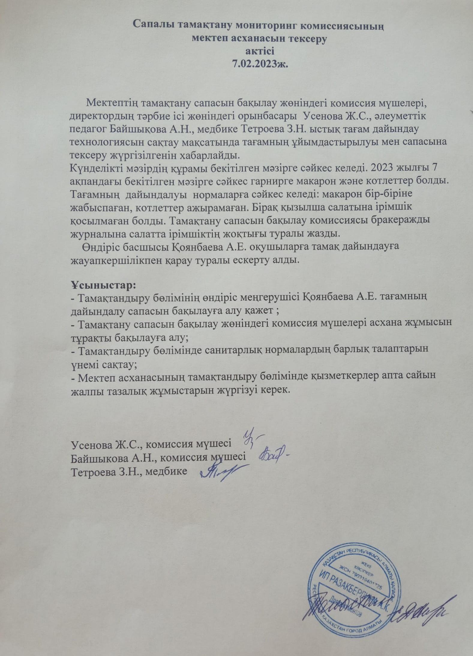07 ақпан 2023 0 1 2 3 4 5 Тамақтану сапасын бақылау бойынша мектеп асханасын тексеру. Обследование школьной столовой комиссией по мониторингу качества питания