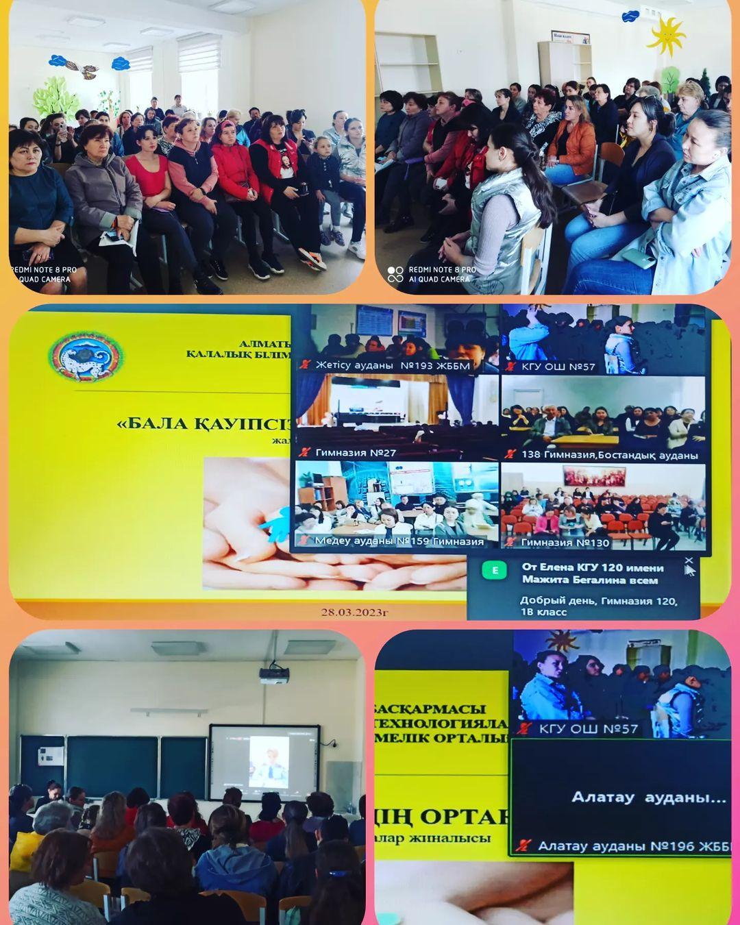 На основании письма № 01.1-22/428 от 27.03.2023 г. «Научно-методического центра новых технологий в образовании» Управления образования г.Алматы с участием Уполномоченного по правам ребенка города Алматы Ажигуловой Х.К. 28.03.2023г. в 15:00ч. состоялось общегородское родительское собрание в онлайн-формате на тему "Безопасность детей - наша общая забота", в котором приняли участие родители учащихся 1-11 классов нашей школы.