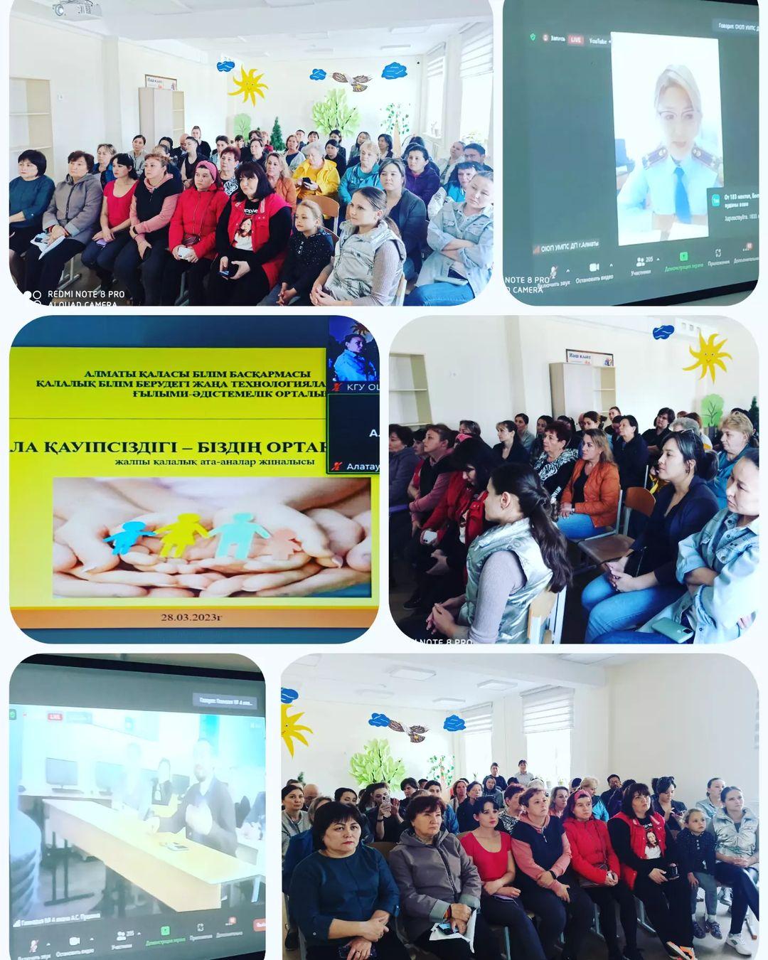 Алматы қаласы Білім басқармасының "Қалалық білім берудегі жаңа технологиялардың ғылыми-әдістемелік орталығының 27.03.2023 жылғы N 01.1-22/428 хаты негізінде, Алматы қаласы бойынша Бала құқықтары жөніндегі уәкілі Х. Қ. Әжіғұлованың және басқа да мүдделі органдарының уәкілдерінің қатысуымен 28.03.2023 жылы сағат 15.00-де онлайн форматта жалпықалалық ата-аналар жиналысы өтті. Жиналысқа мектебіміздің 1-11 сынып оқушыларының ата - аналары қатысты.