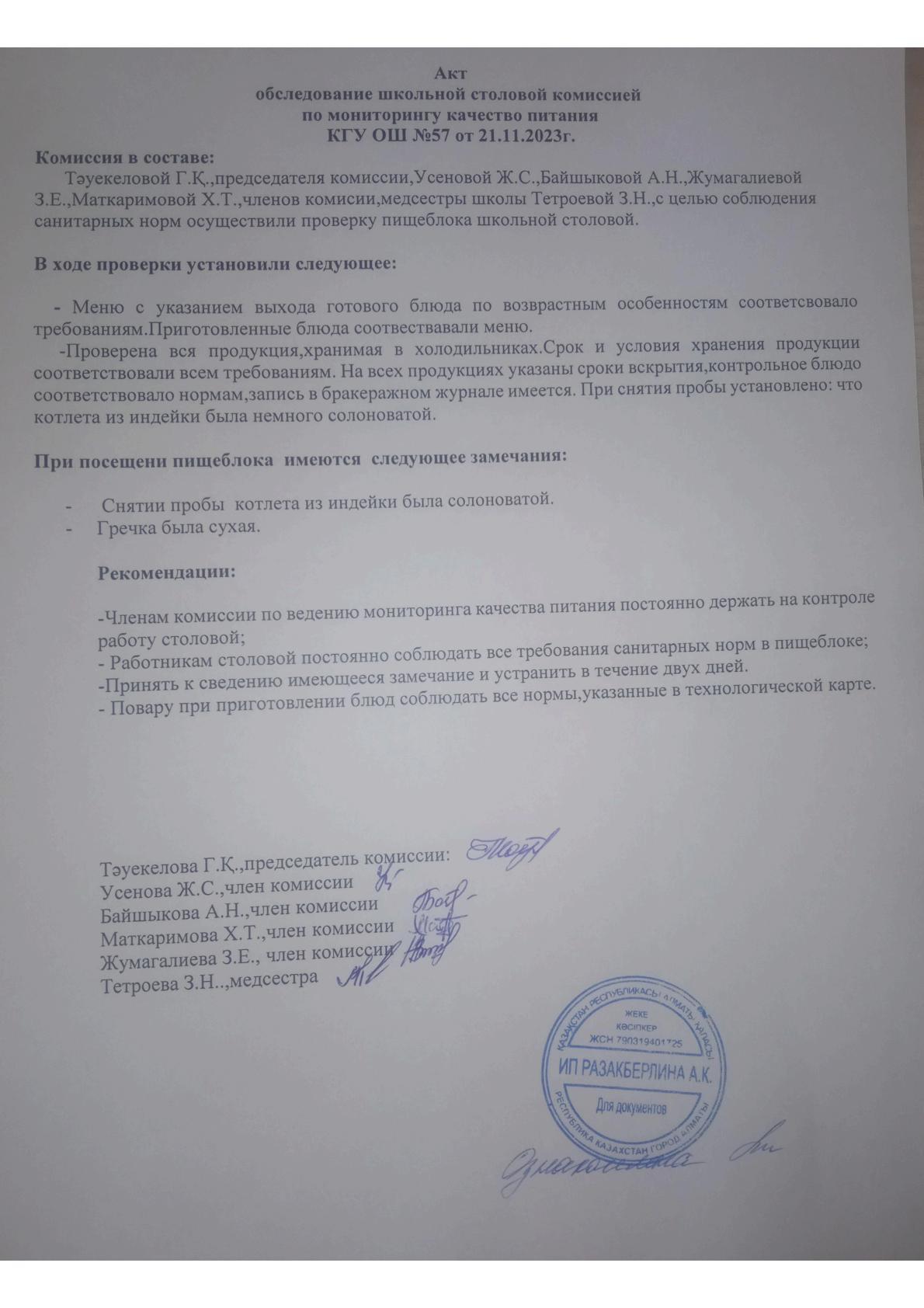 Мектеп асханасын тексеру актісі. Акт обследования школьной столовой
