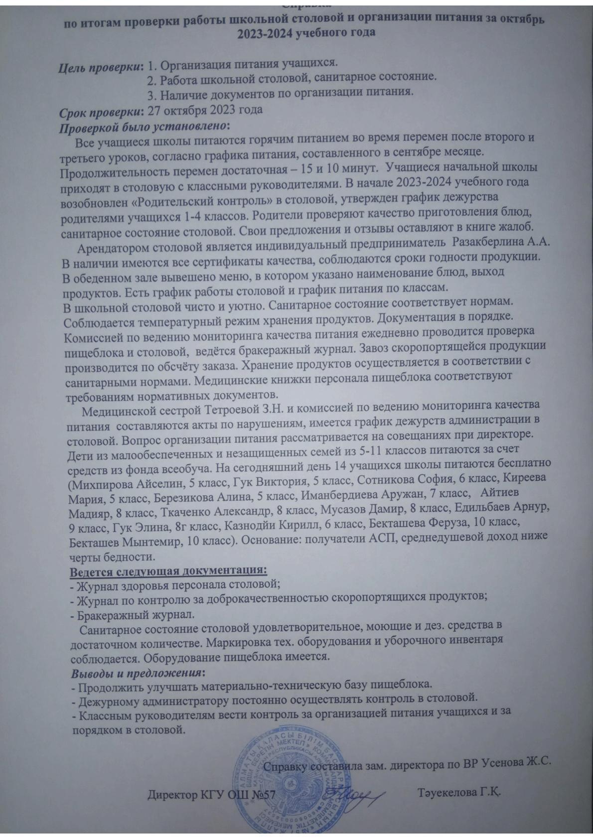27 қазан 2023 0 1 2 3 4 5 Мектеп асханасының жұмысын тексеру қорытындысы бойынша анықтама Справка по итогам проверки работы школьной столовой