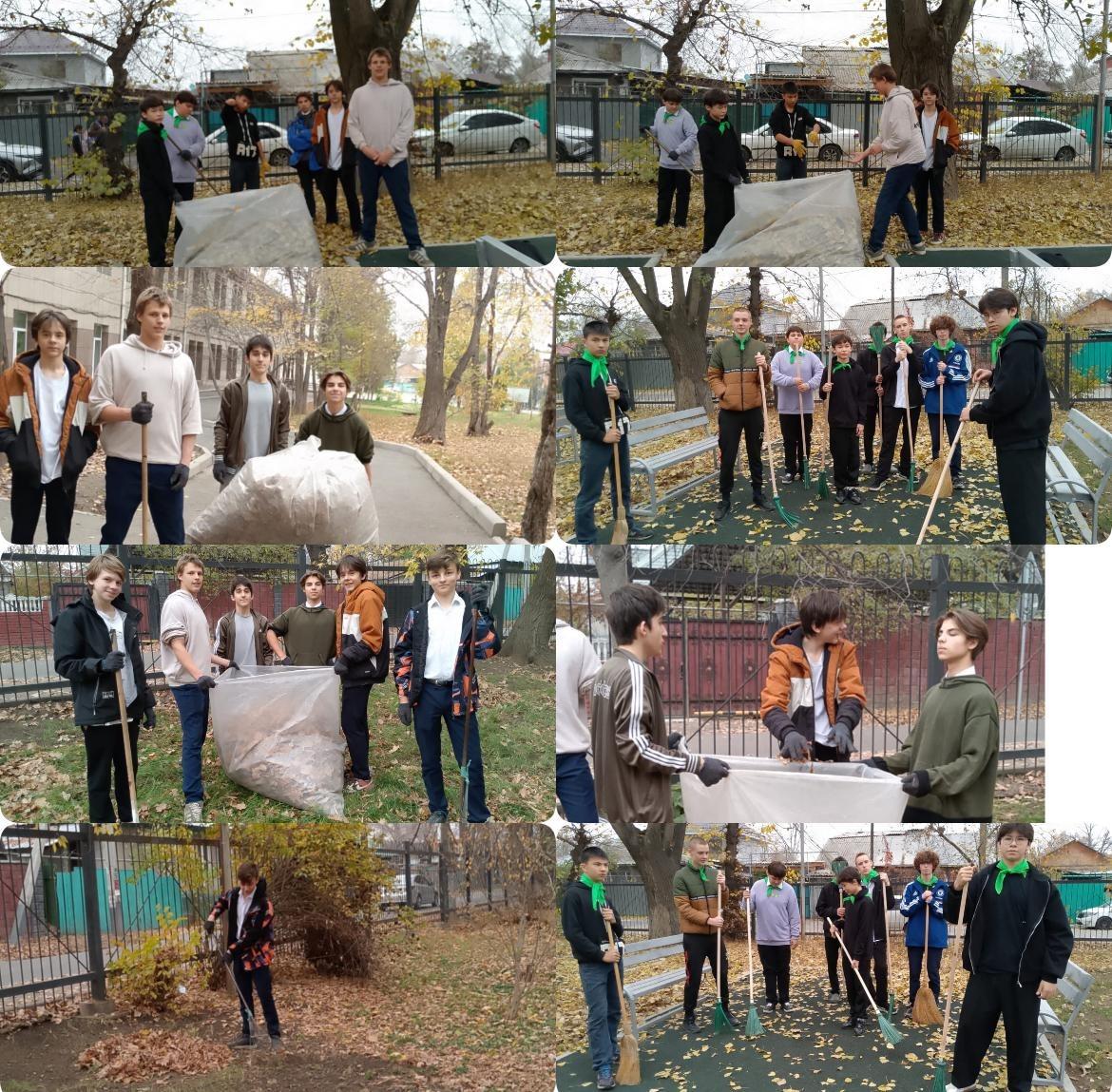 В #57школежетысускогорайонагородаалматы еженедельно проводятся акции по уборке территории школы. И в этот раз она началась с уборки листьев. Ребята собрали листья и ветки, которые упали с деревьев. Затем они убирали мусор на площадке перед школой.
