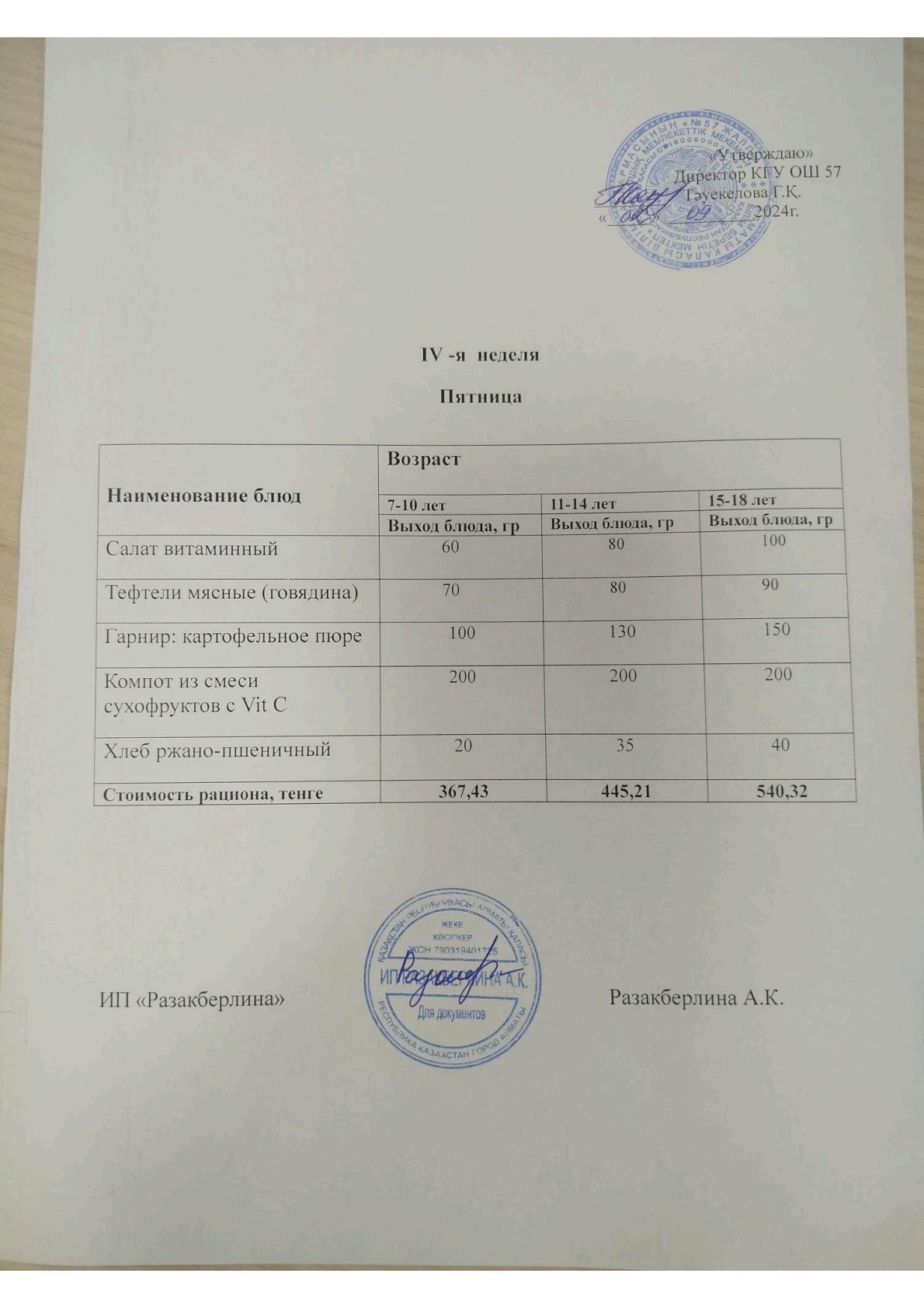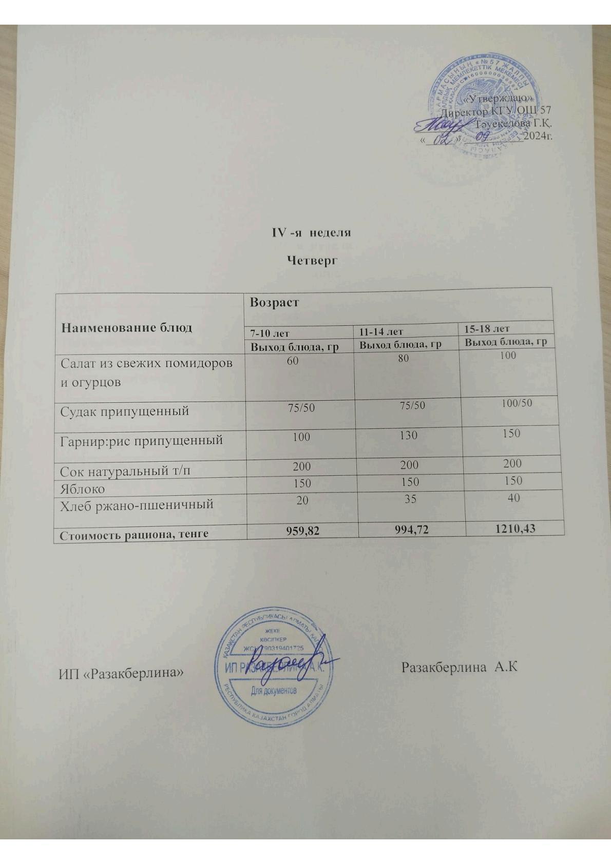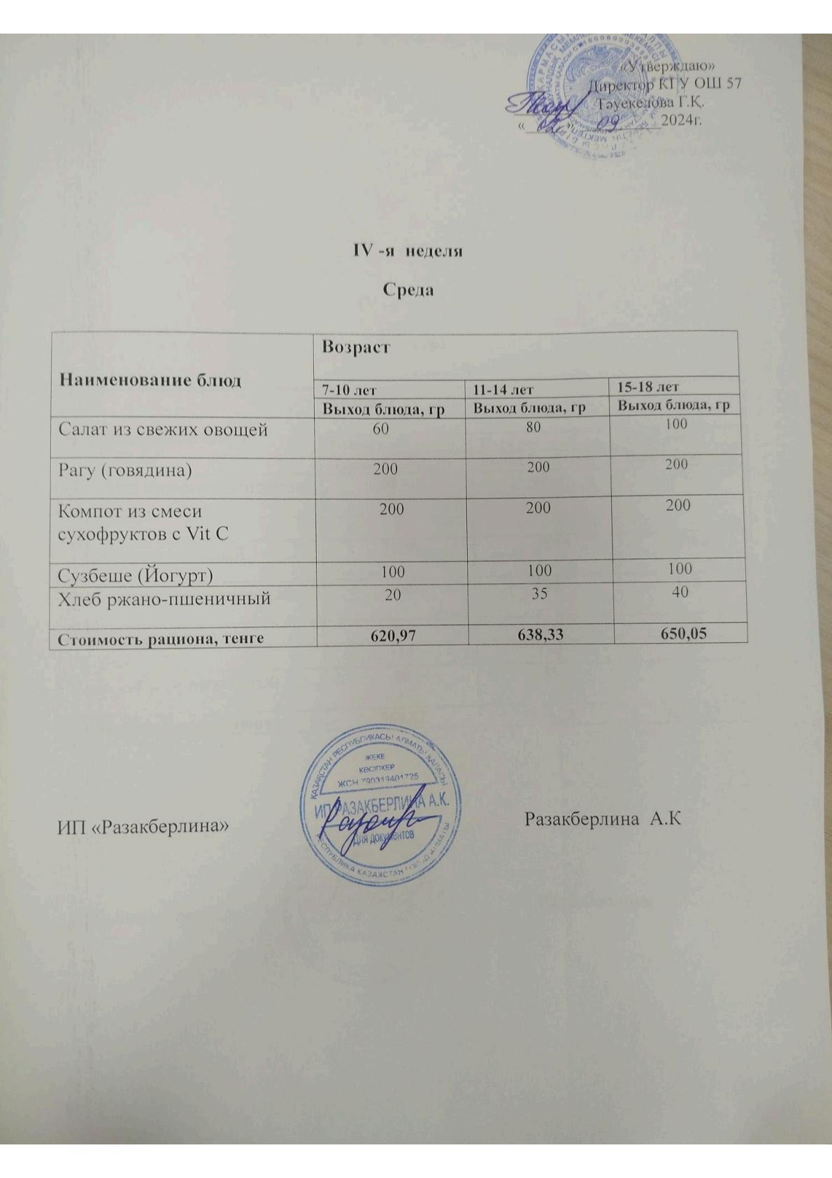4 апта мәзірі, сәрсенбі Меню 4 неделя, среда