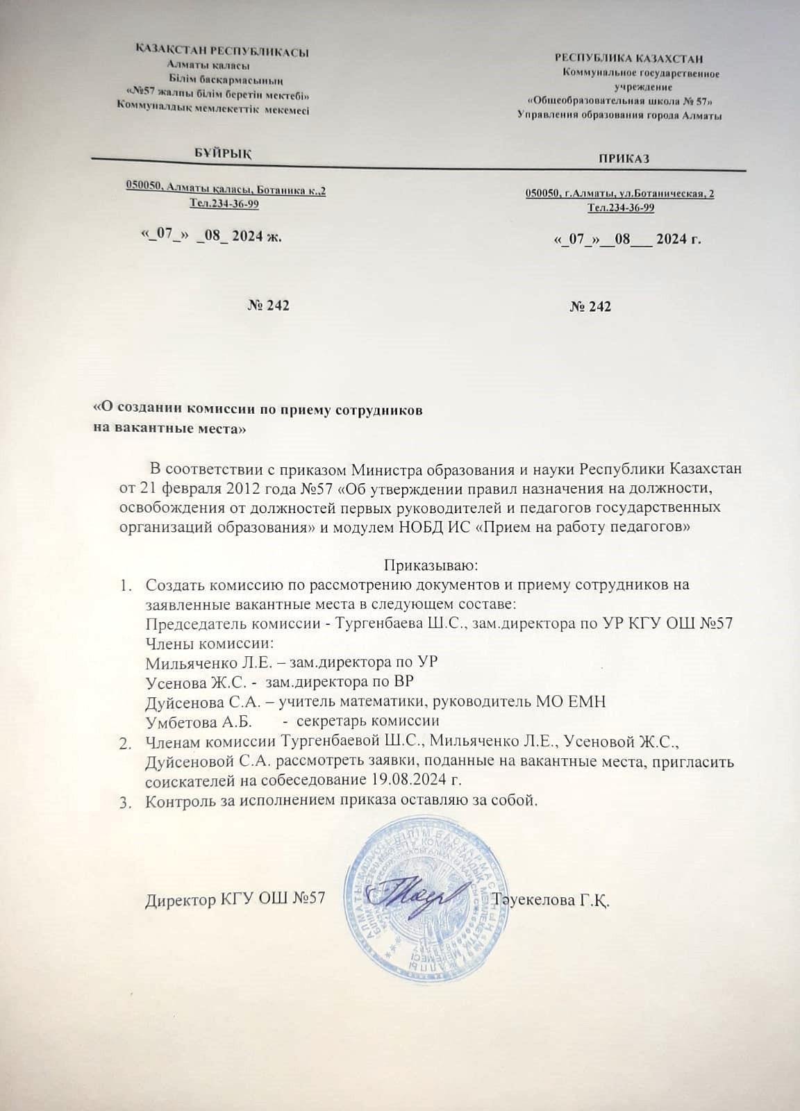 07 тамыз 2024 0 1 2 3 4 5 Қызметкерлерді бос орындарға қабылдау жөніндегі комиссия құру туралы бұйрық Приказ о создании комиссии по приему сотрудников на вакантные места