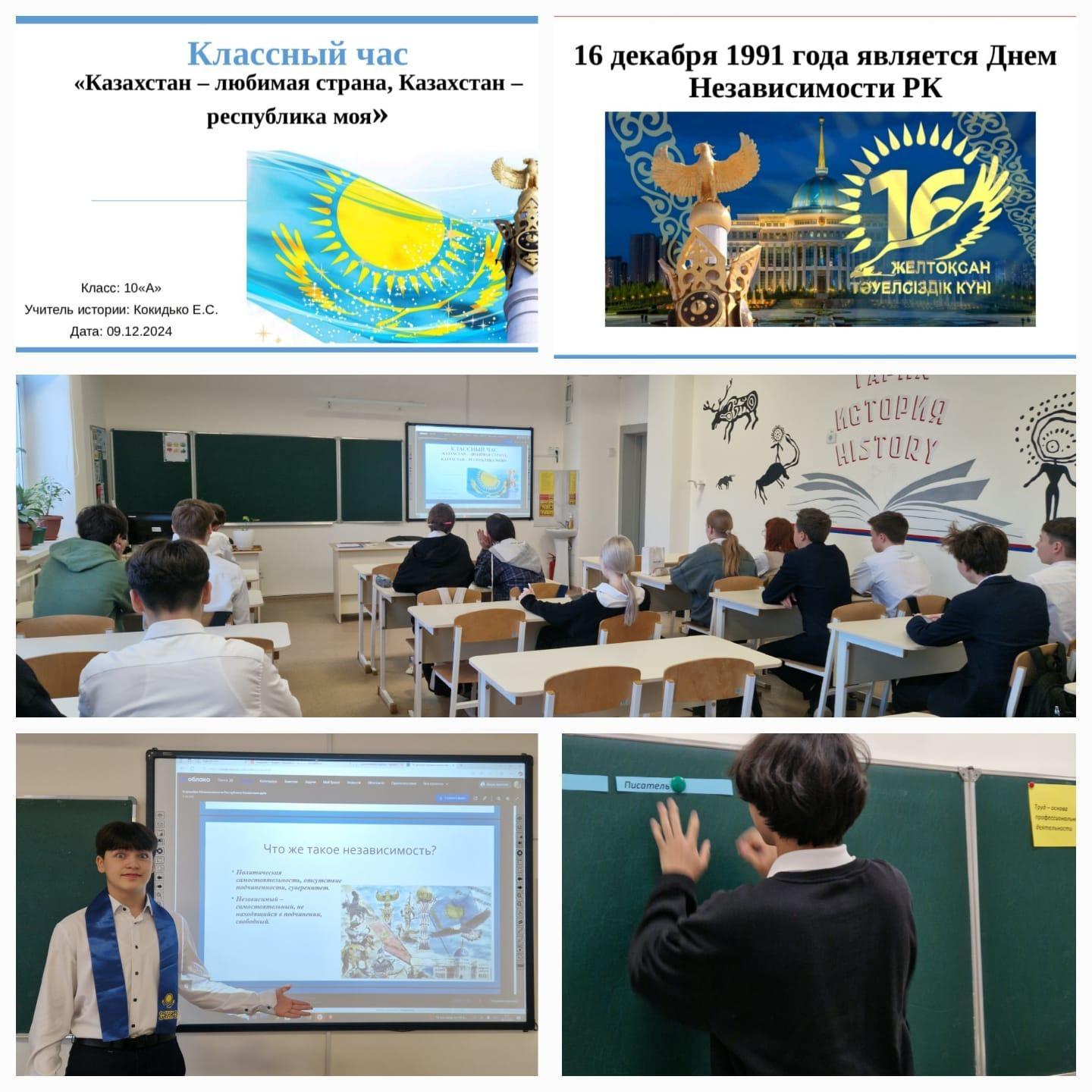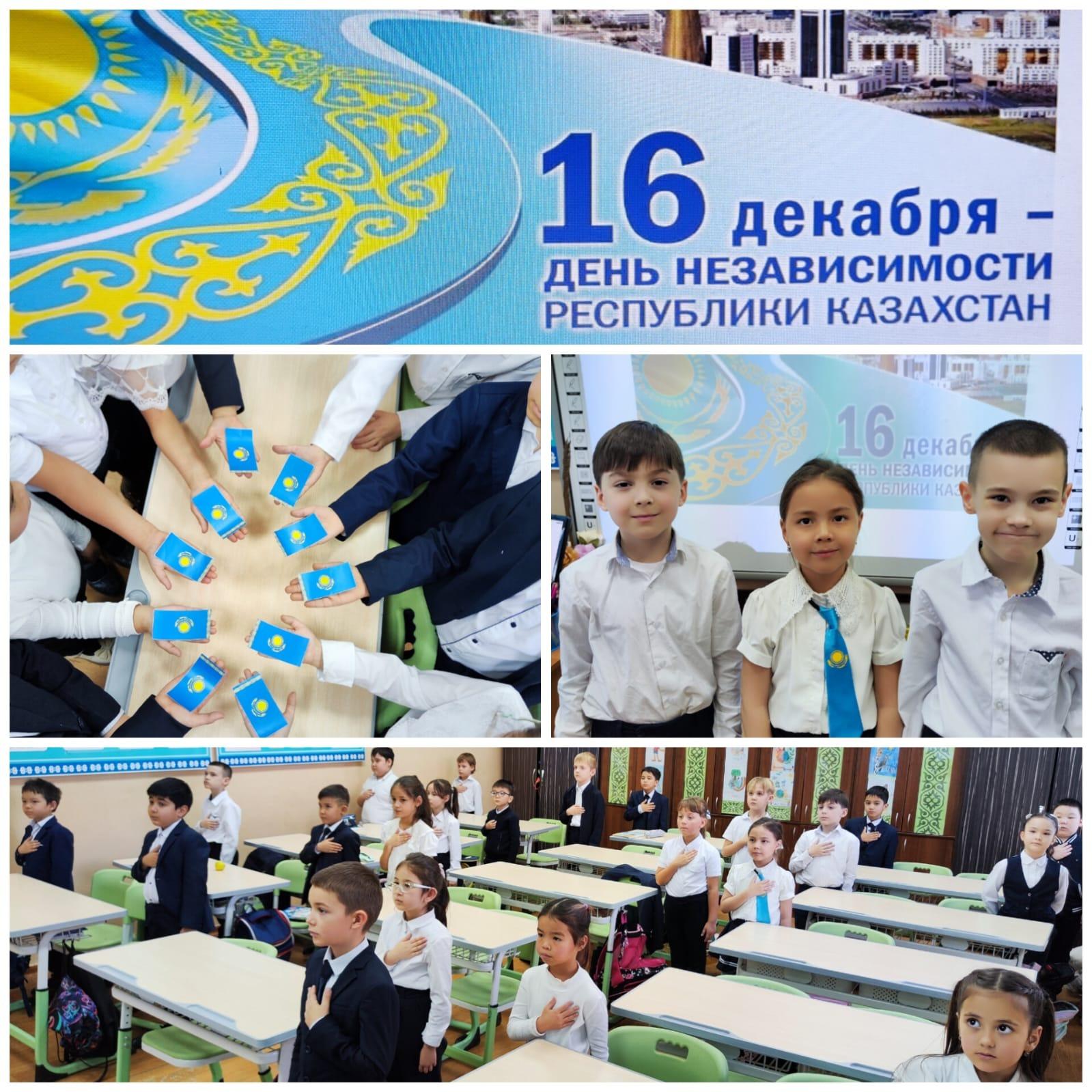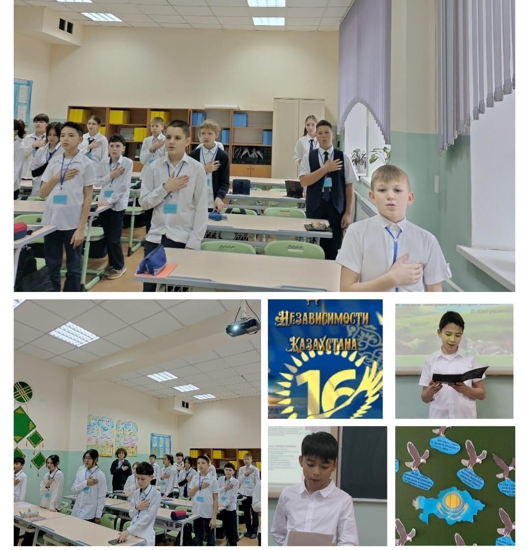 9.12.2024г. в 1-11 классах были проведены классные часы, посвященные Дню Независимости РК. В ходе классных часов были озвучены основные этапы в жизни нашего государства – от обретения независимости и до настоящего момента. Использован богатый видео материал, вызвавший большой интерес у учащихся.