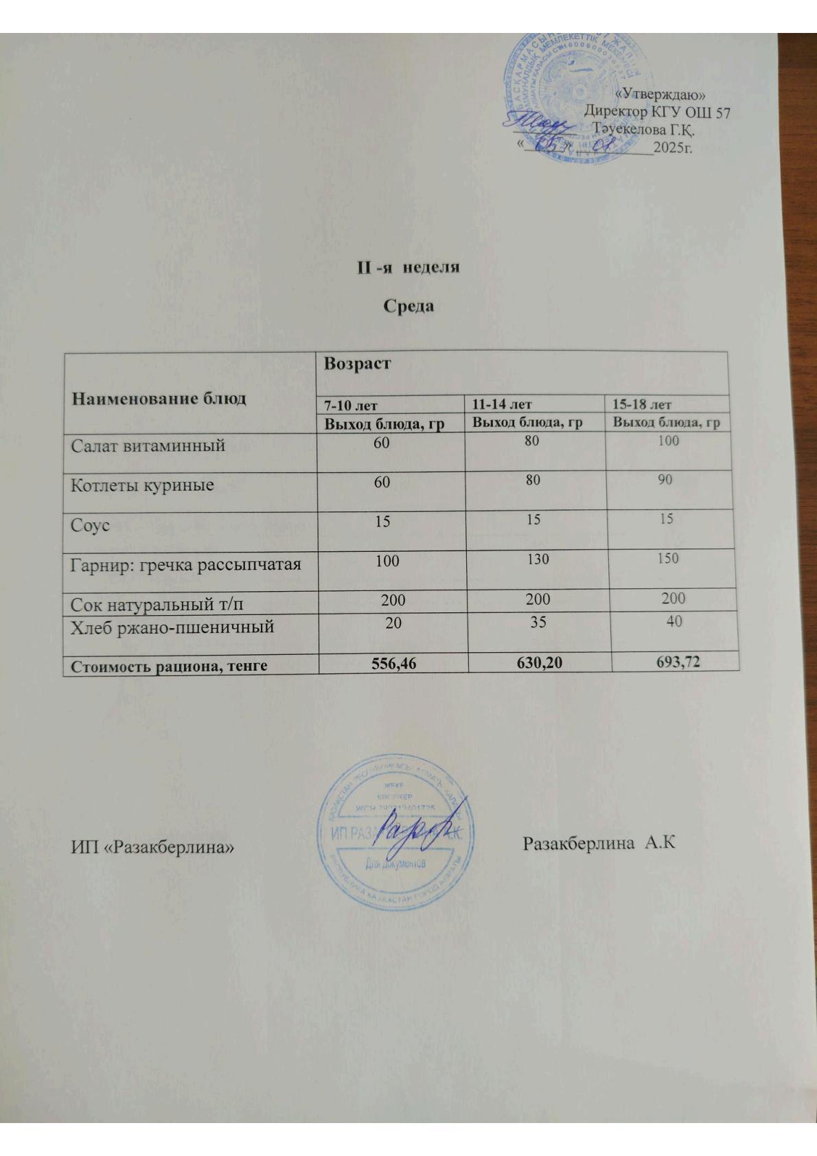 2 апта мәзірі, сәрсенбі Меню 2 неделя, среда