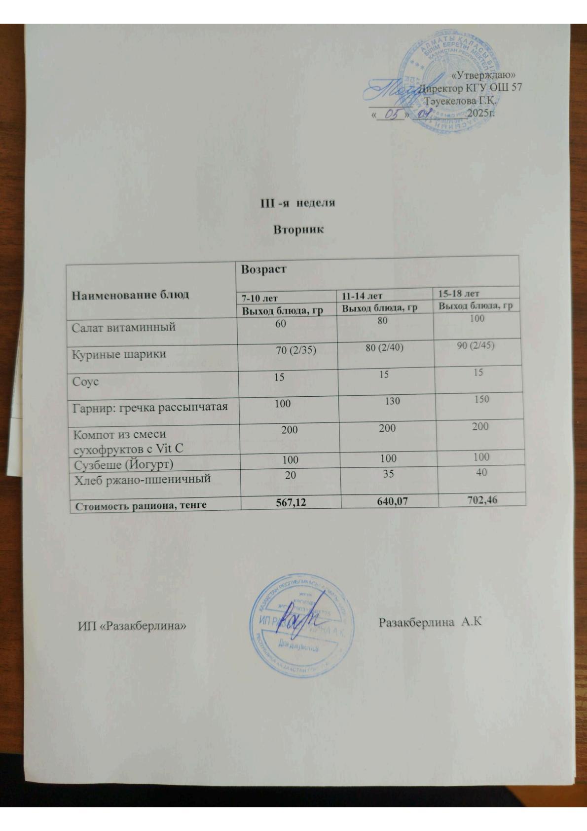2 апта мәзірі, сейсенбі Меню 2 неделя, вторник