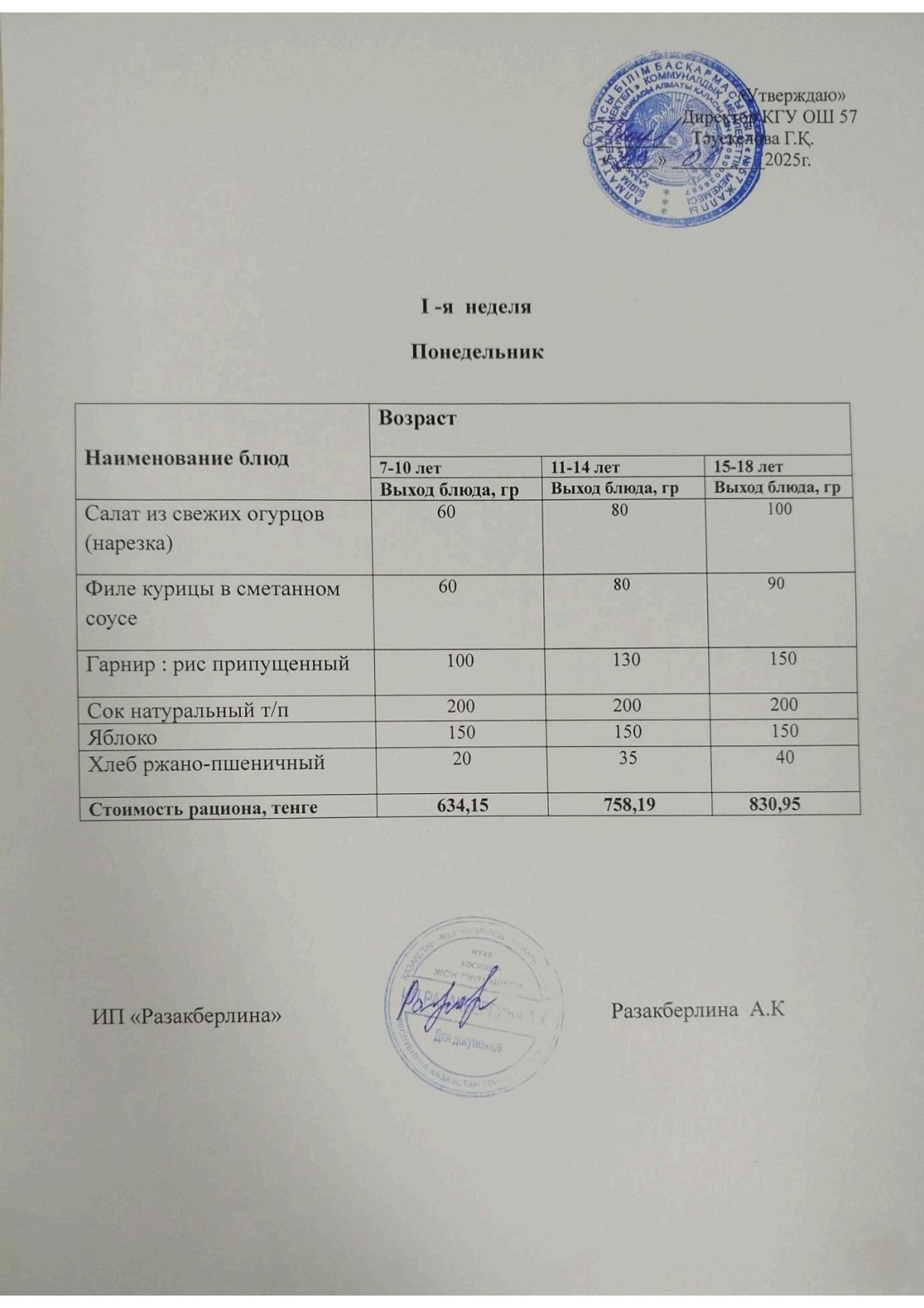 1 апта мәзірі, дүйсенбі Меню 1 неделя, понедельник