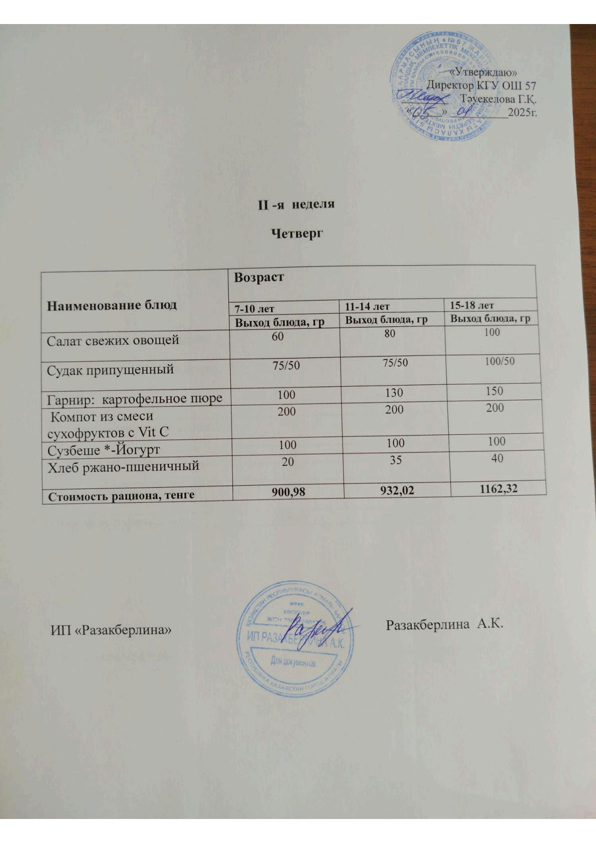 2 апта мәзірі, бейсенбі Меню 2 неделя, четверг