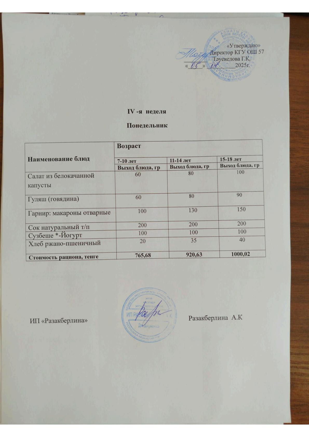 4 апта мәзірі, дүйсенбі Меню 4 неделя, понедельник
