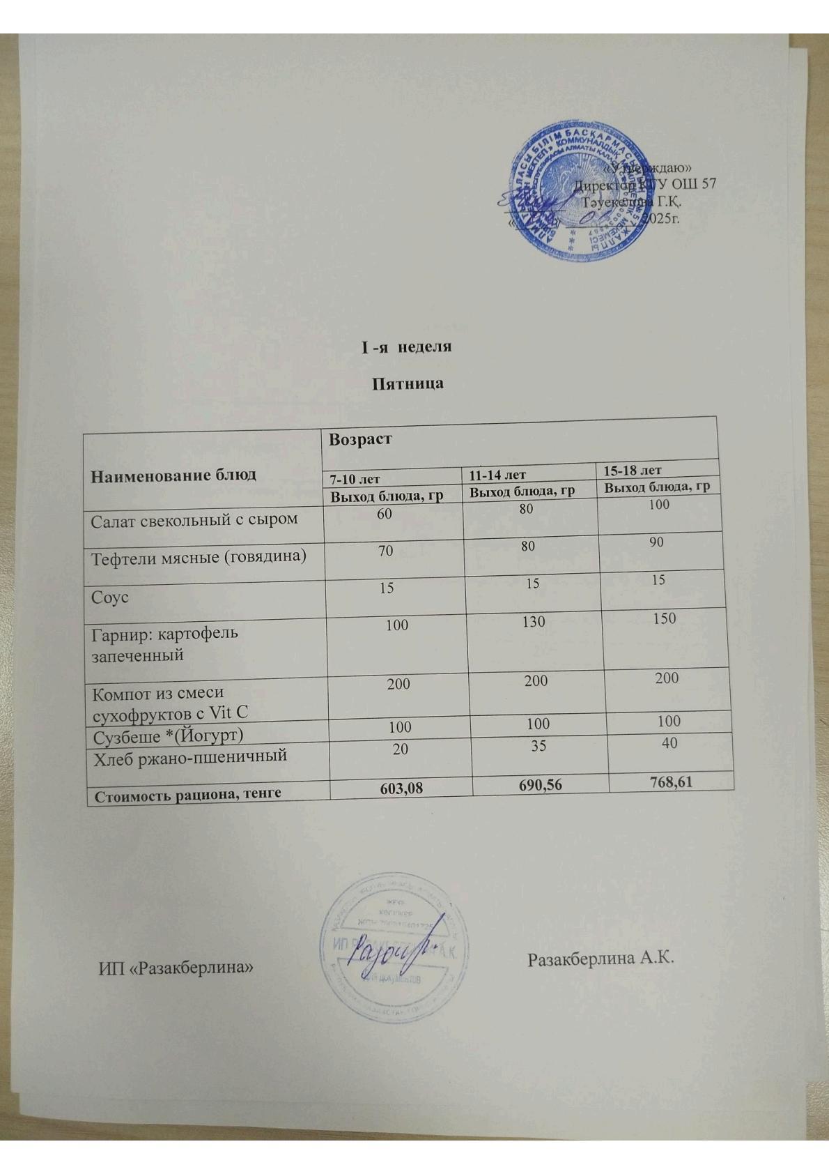 1 апта мәзірі, жұма Меню 1 неделя, пятница