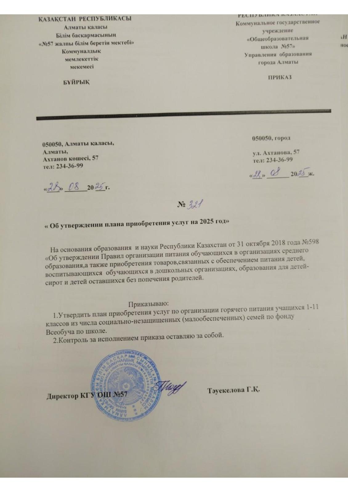 28 тамыз 2025 0 1 2 3 4 5 2025 жылға қызметтерді сатып алу жоспарын бекіту туралы Об утверждении плана приобретения услуг на 2025 г.