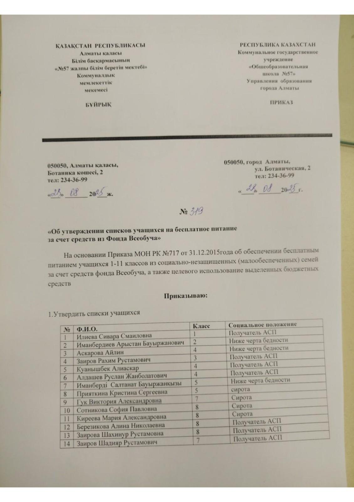 28 тамыз 2025 0 1 2 3 4 5 Тегін тамақпен қамтылатын оқушылардың тізімін бекіту туралы бұйрық Приказ об утверждении списка учащихся на бесплатное питание