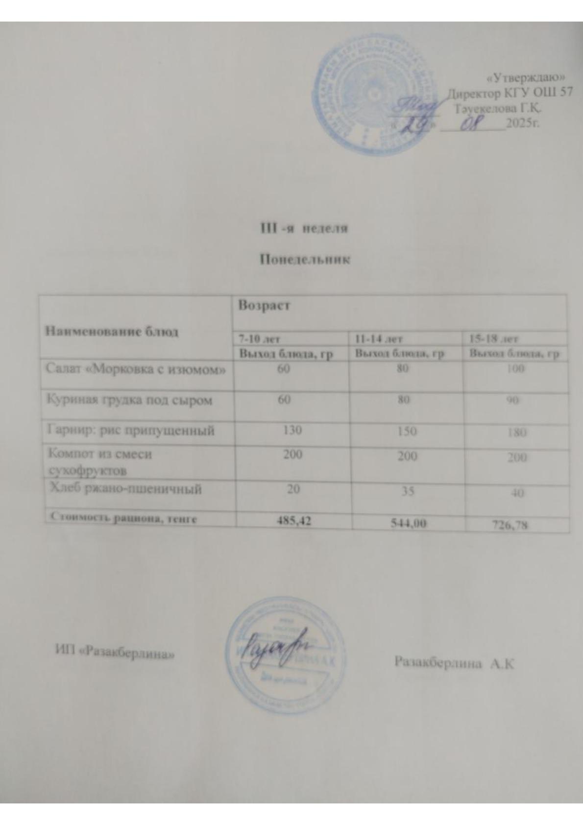 3-апта ас мәзірі, дүйсенбі Меню 3 неделя, понедельник