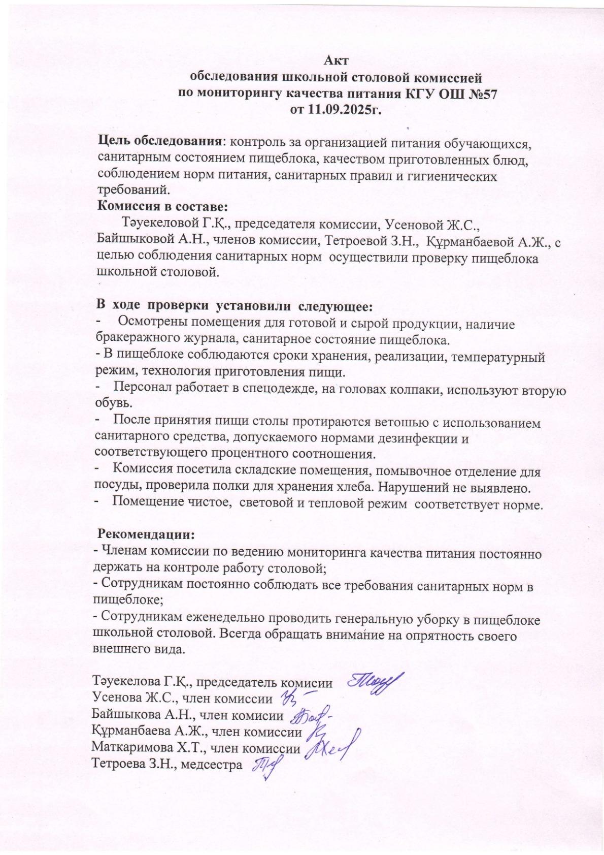 Мектеп асханасын тексеру актісі Акт обследования школьной столовой