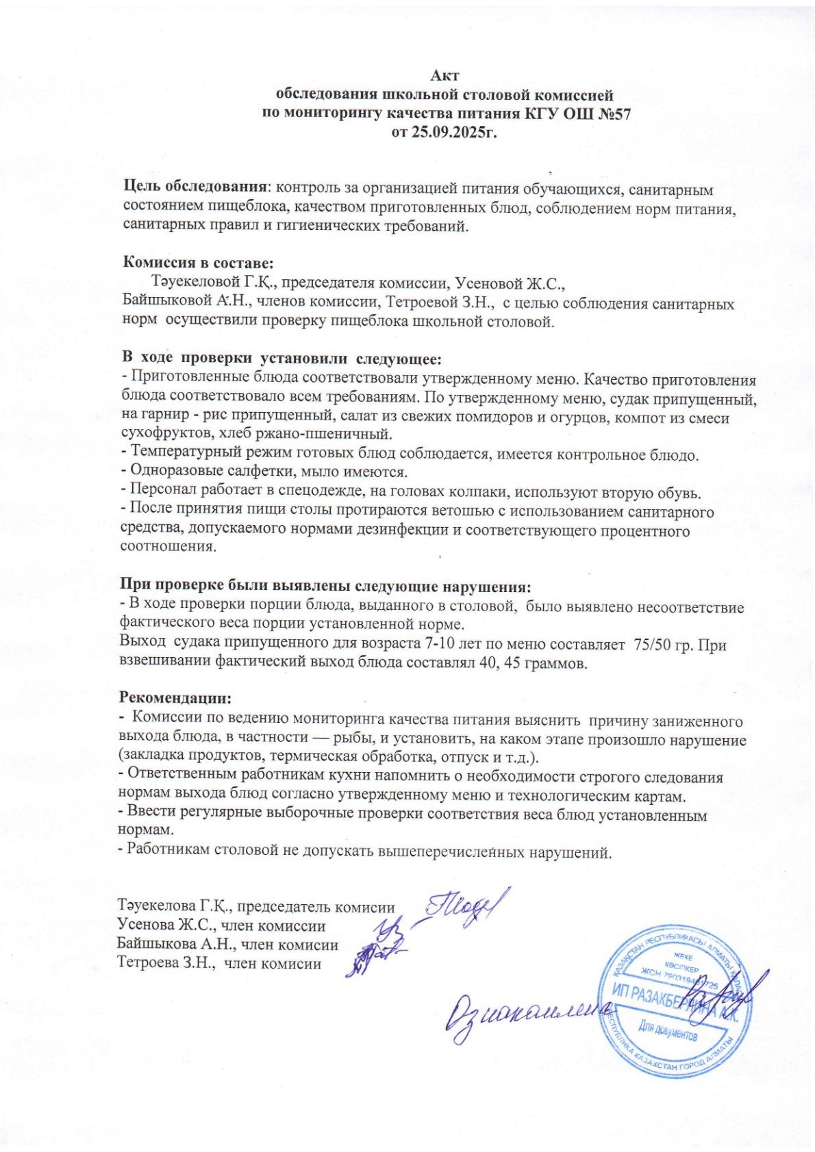 Мектеп асханасын тексеру актісі Акт обследования школьной столовой