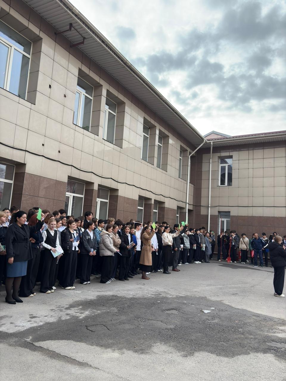 🔔 Дабыл сигналы берілгеннен кейін оқушылар мен мұғалімдер оқу кабинеттерінен тәртіппен шығып, қауіпсіз аймаққа жиналды.