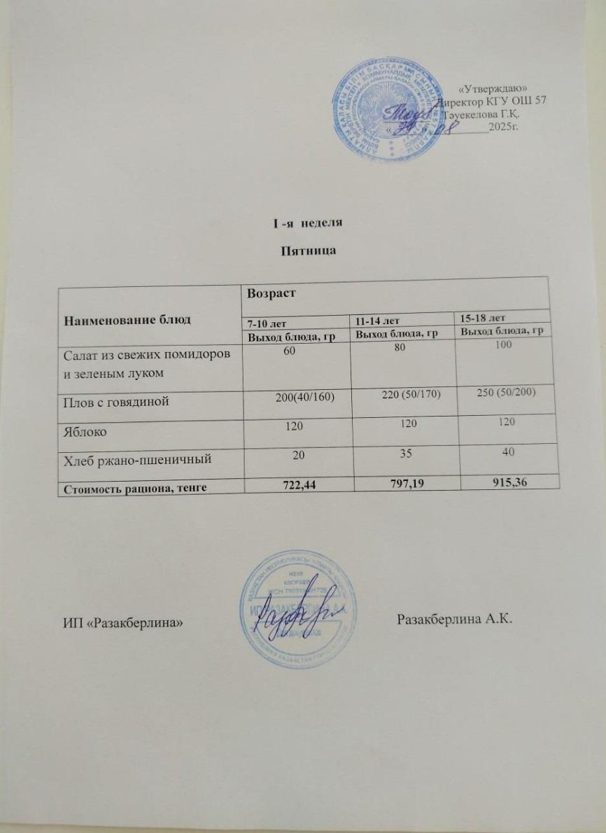 1-апта ас мәзірі, жұма Меню 1 неделя, пятница