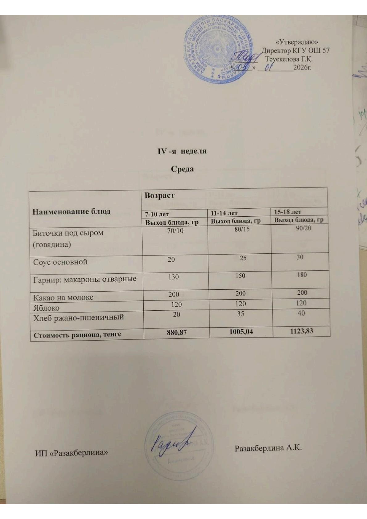 4-апта мәзірі, сәрсенбі. Меню 4 неделя, среда