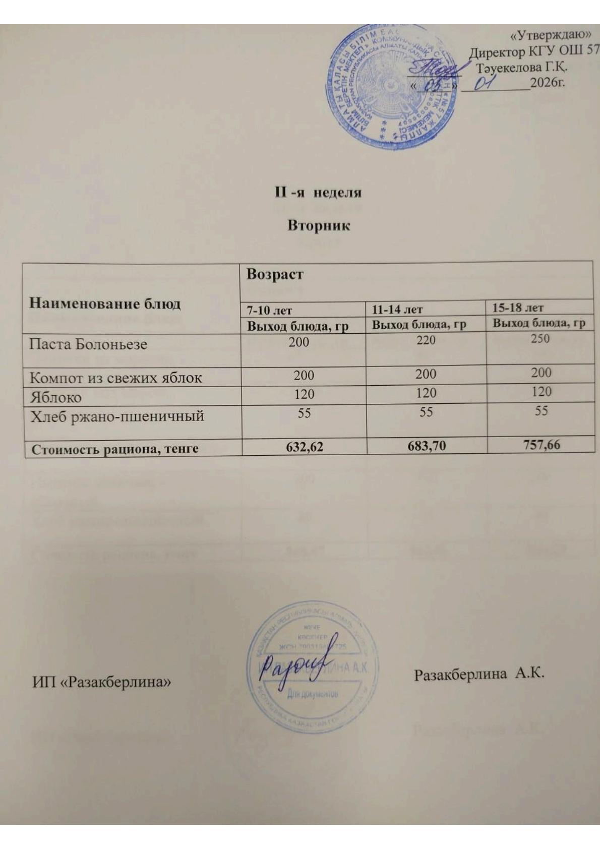 1-апта ас мәзірі, сейсенбі Меню 1 неделя, вторник
