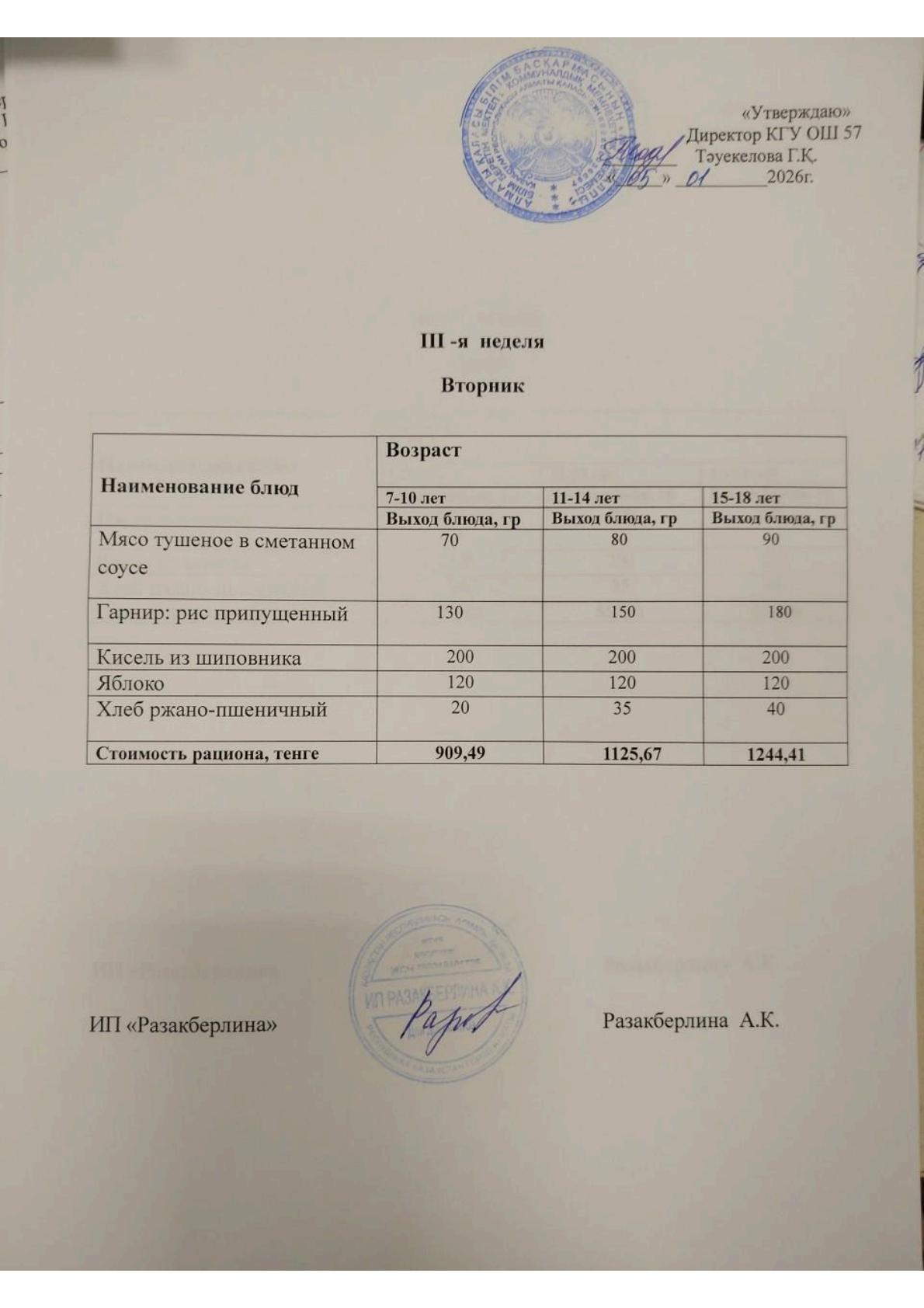 1-апта ас мәзірі, сейсенбі Меню 1 неделя, вторник