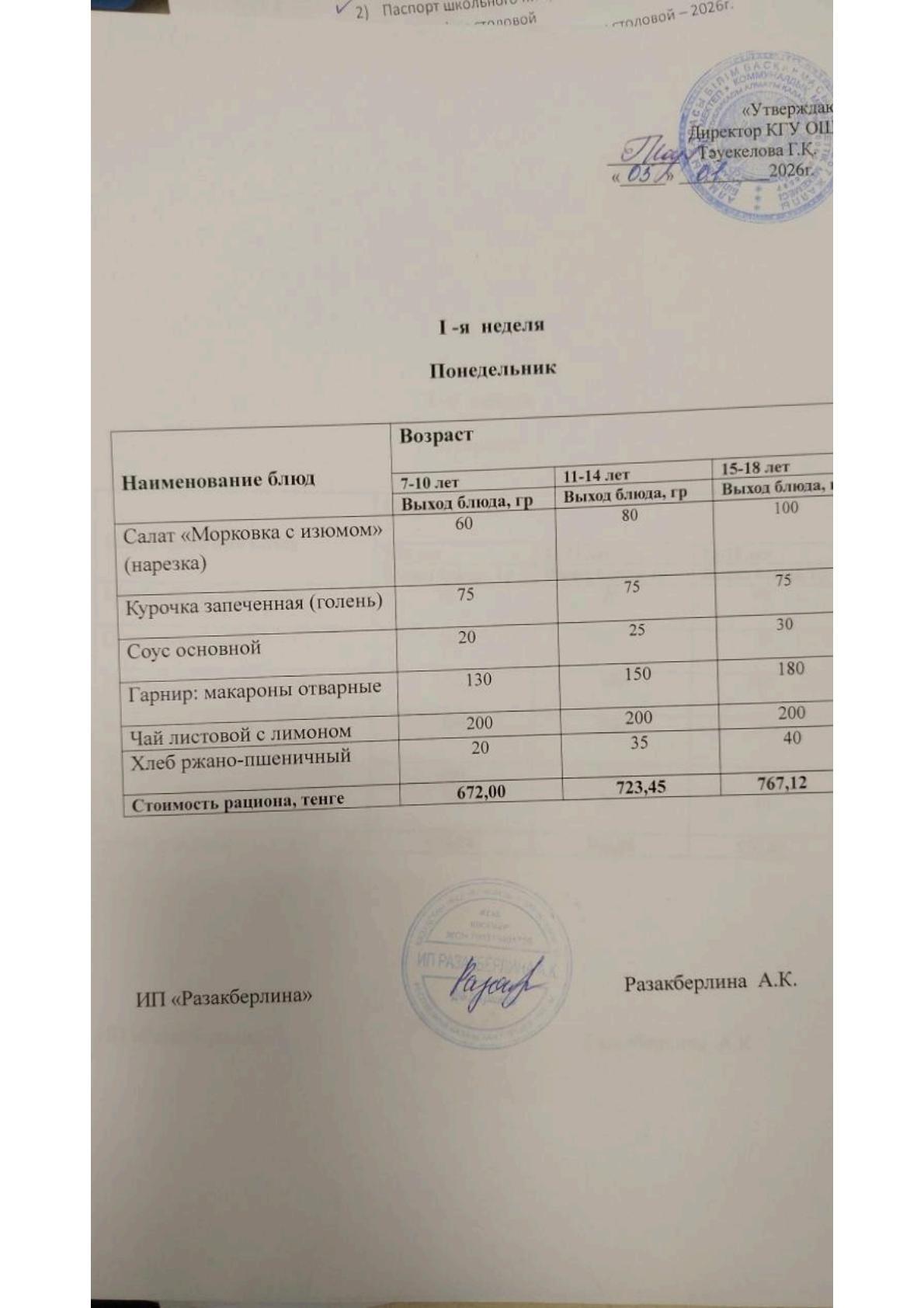 2-апта ас мәзірі, дүйсенбі. Меню 2 неделя, понедельник