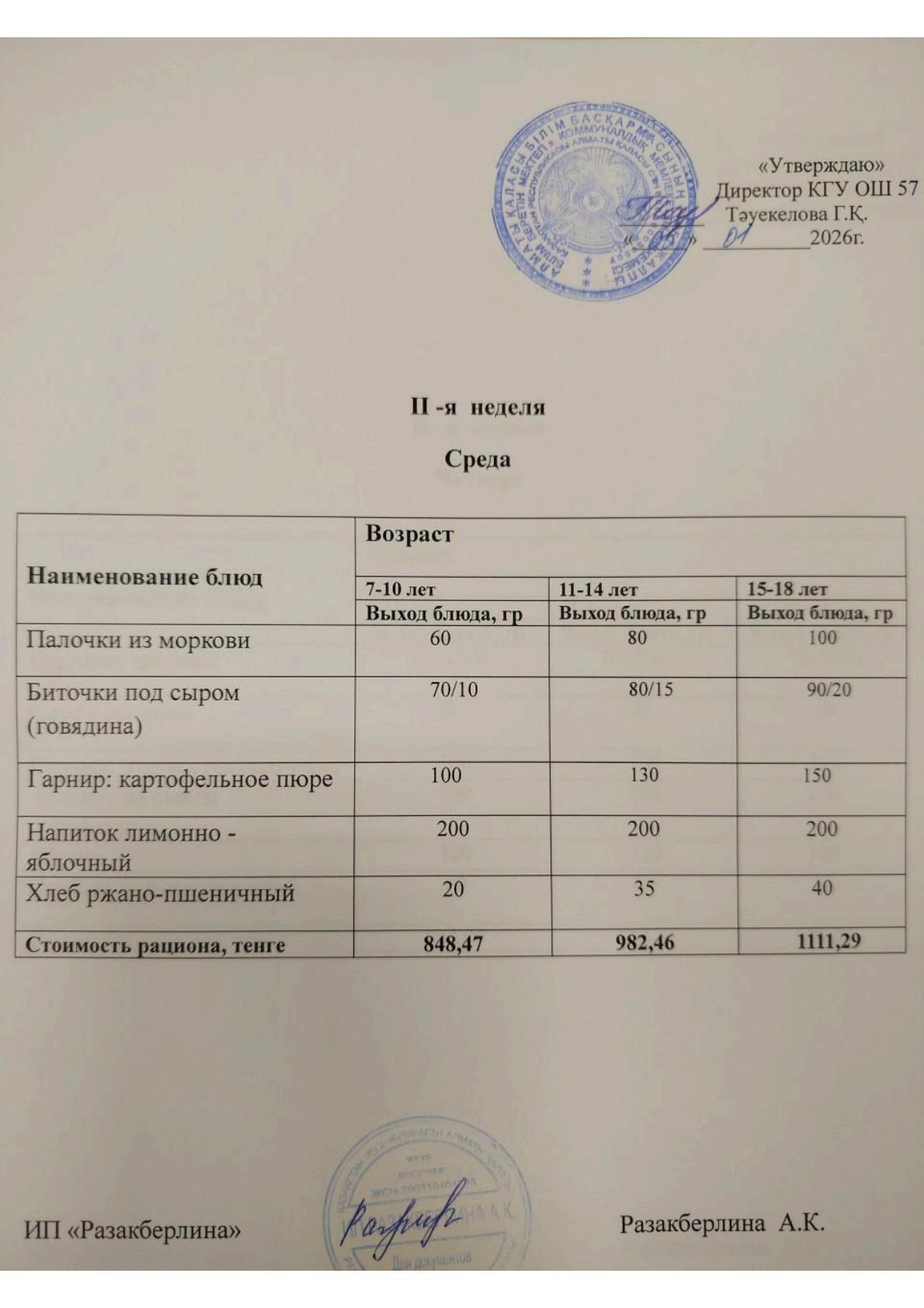2-апта ас мәзірі, сәрсенбі Меню 2 неделя, среда