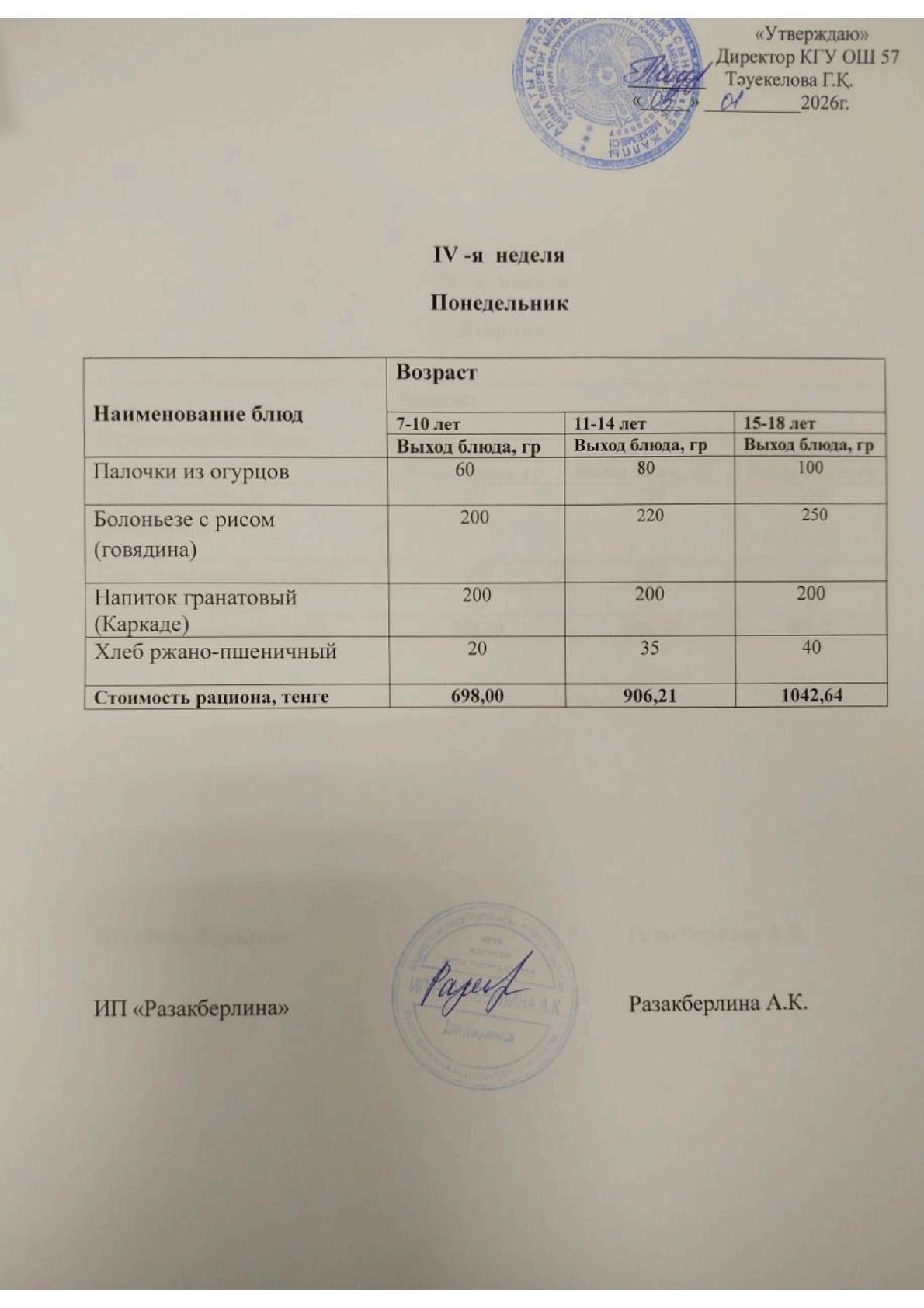 2-апта ас мәзірі, дүйсенбі. Меню 2 неделя, понедельник