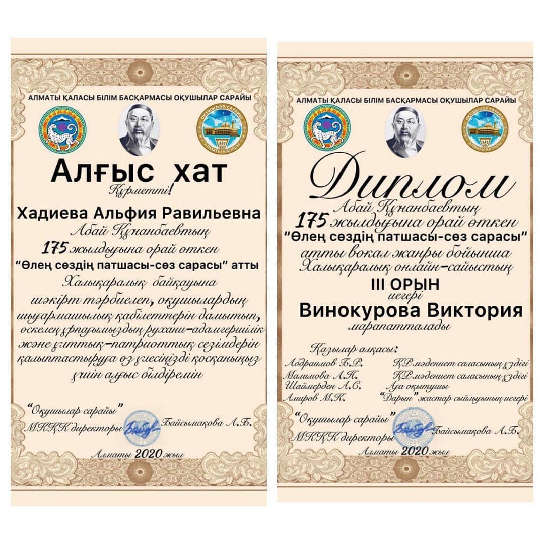 Винокурова Виктория, ученица 4 класса приняла участие в Международном-онлайн конкурсе "Өлең сөздің патшасы- сөз сарасы", посвященном 175-летию со дня рождения Абая Кунанбаева и заняла III место. Конкурс организован Дворцом школьников УО г.Алматы. Руководитель Альфия Хадиева, учитель музыки награждена Благодарственным письмом за развитие творческих способностей и вклад в формирование духовно-нравственного и патриотических чувств подрастающего поколения. ПОЗДРАВЛЯЕМ ПОБЕДИТЕЛЕЙ!!!