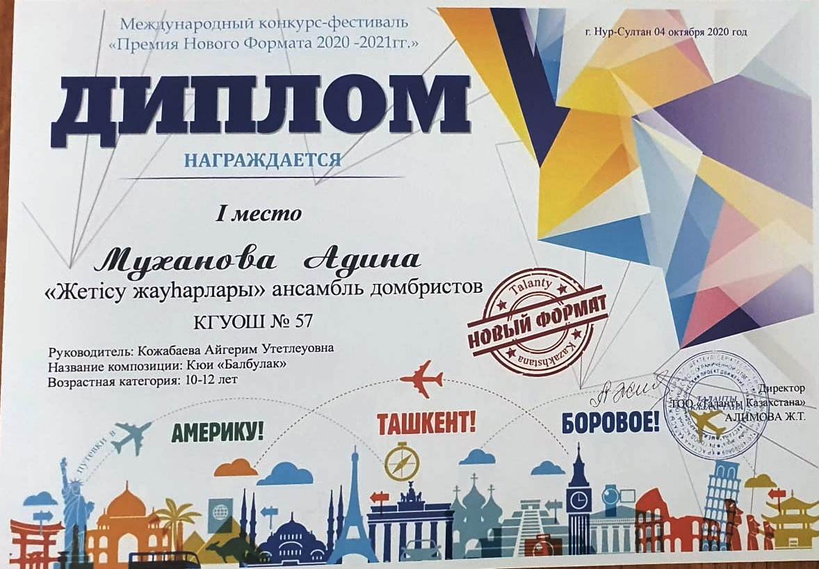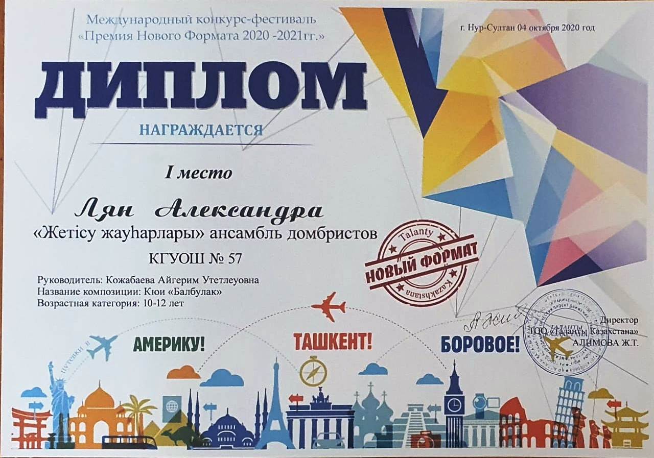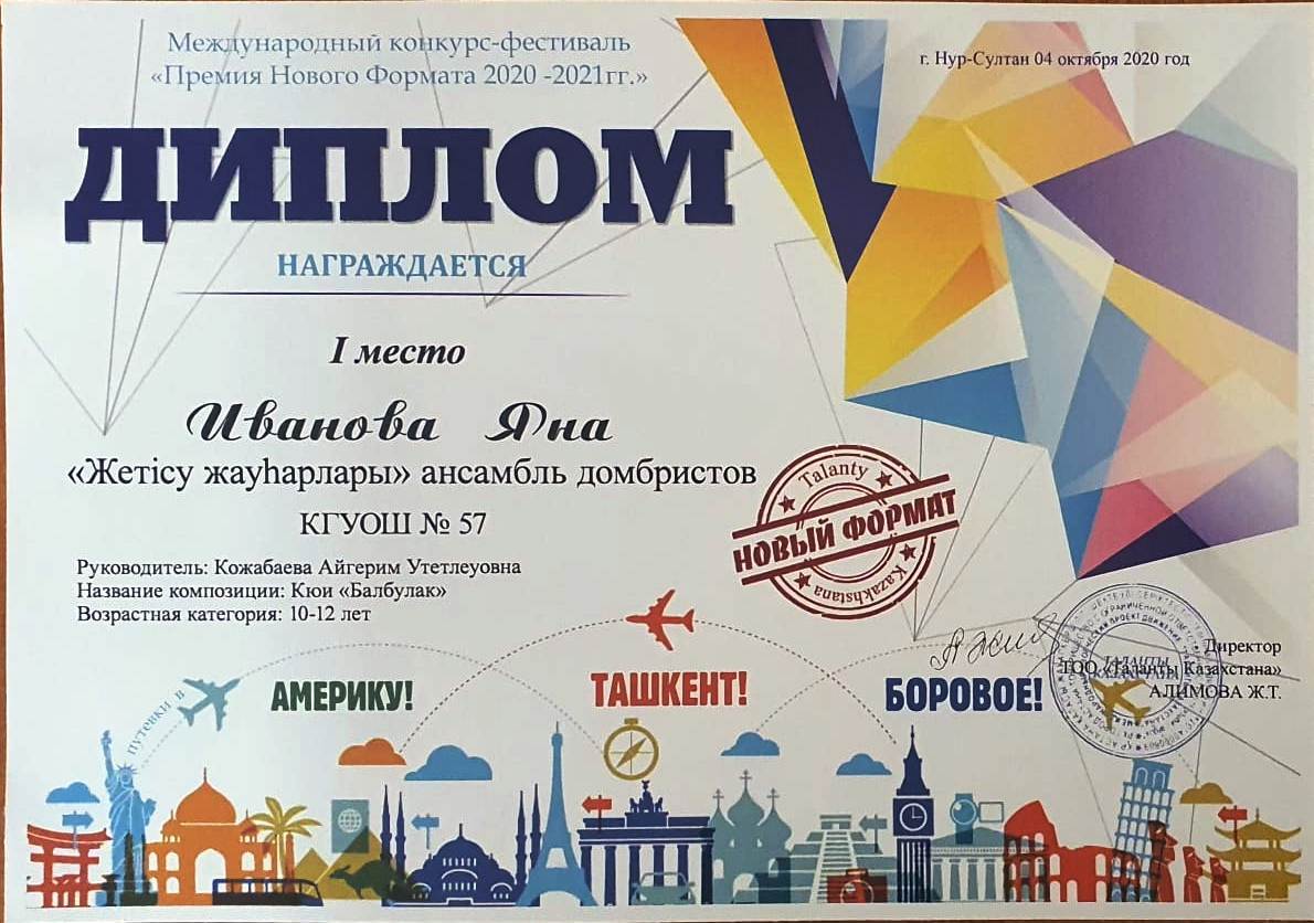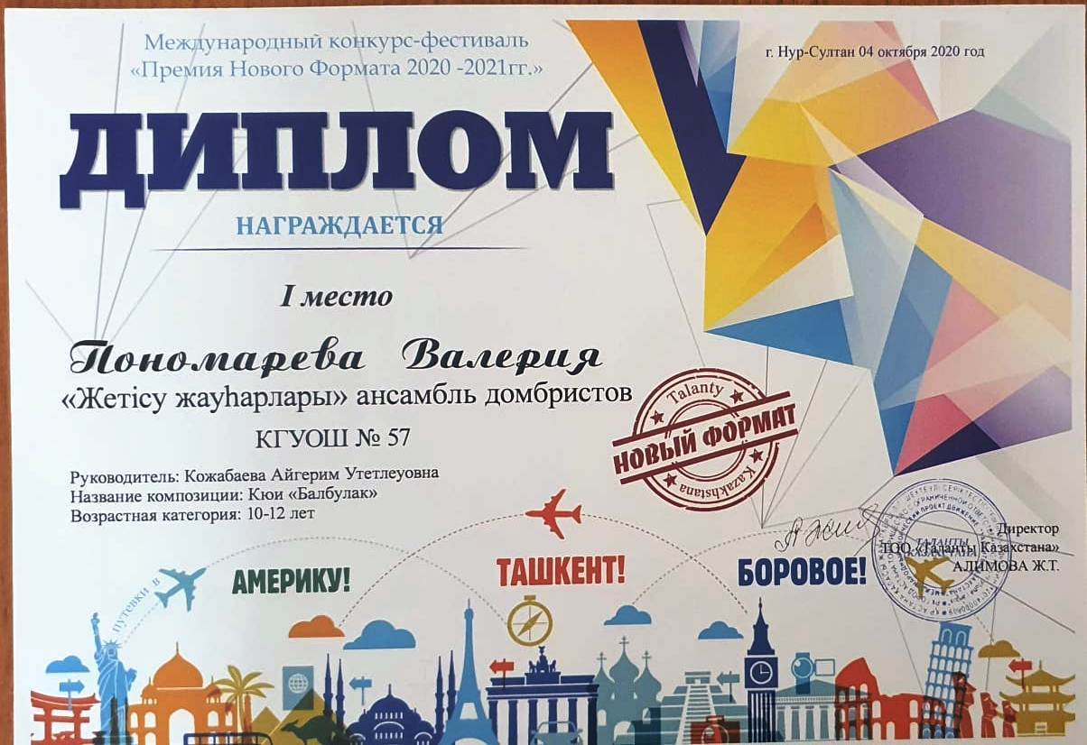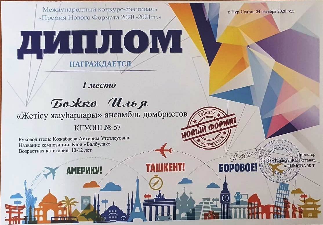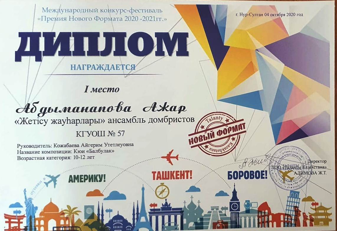 18 қазан 2020 0 1 2 3 4 5 Всегда оставайтесь победителями! Ансамбль домбристов "Жетісу жауһарлары" принял участие в международном фестиваль - конкурсе "Премия нового формата 2020-2021 года". Исполнили күй "Балбұлақ,". Заняли I место. Руководитель А.Кожабаева. Всегда оставайтесь победителями!